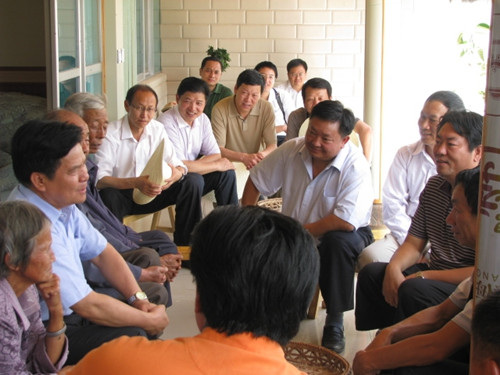 2011年,时任云南省委副书记李纪恒(左二)到漾濞县苍山西镇调研,与村民和指导员谈。